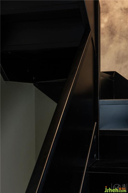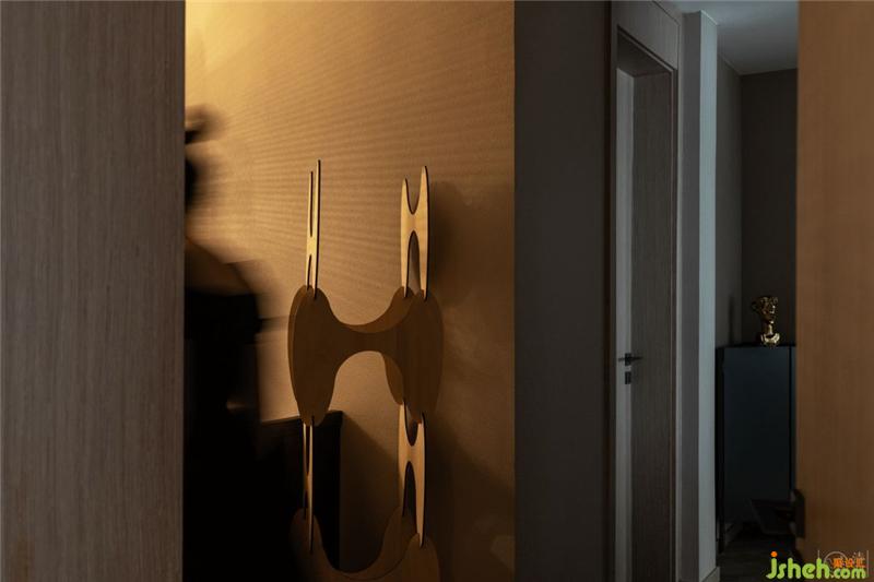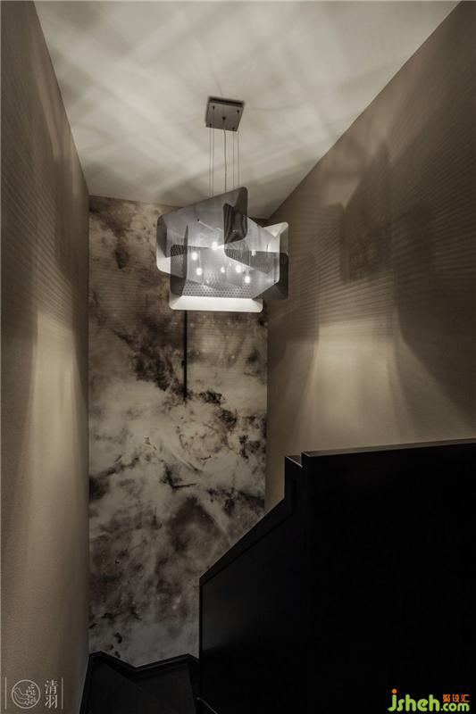 由于是復式結(jié)構(gòu),連接兩層樓的樓梯相對不會太寬太長。我們結(jié)合TBS木質(zhì)樓梯簡單利落的線條,用燈與藝術(shù)裝置產(chǎn)生的光影效果制造出空間交錯感,來弱化較狹窄空間可能會產(chǎn)生的壓迫感。而在這樣的光影下,Nebulae的Italy Wall & Deco 墻紙讓樓梯間的墻面好似時空隧道的入口……