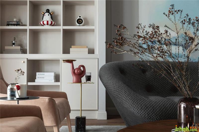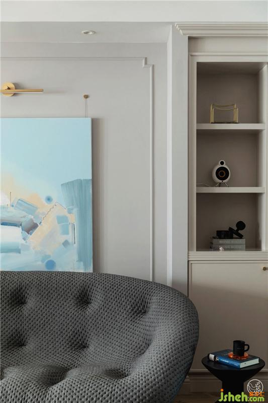 沙發(fā)背景墻的奶油白收納展示柜是現(xiàn)場(chǎng)制作的,大氣簡(jiǎn)潔。青年藝術(shù)家楊家勇的原創(chuàng)油畫(huà),色彩淡雅,線條柔和而抽象,更添一絲寧?kù)o雅致。室內(nèi)設(shè)計(jì)師