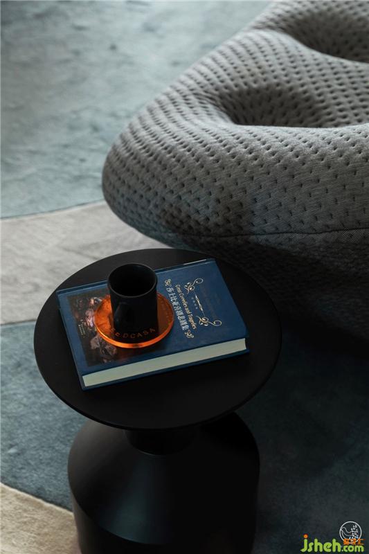 于是有意在選擇地毯時(shí),呼應(yīng)油畫(huà)的黃藍(lán)色調(diào),圓形色塊的線條又和沙發(fā)的曲線達(dá)成一致。