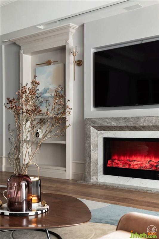 電視背景墻做了最簡(jiǎn)單的線條,勾勒出頗具儀式感又不會(huì)過(guò)于拘謹(jǐn)?shù)姆諊?。電子壁爐是整個(gè)家的情感加熱器,夜幕降臨,一家人圍坐在一起,重溫一部經(jīng)典動(dòng)畫(huà),這就是最好的時(shí)光。