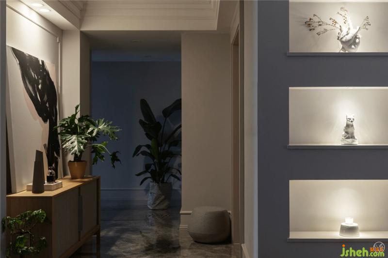 入戶和走廊在整個(gè)戶型上來(lái)看,比較流轉(zhuǎn),采光也不是很棒,于是我們干脆就利用建筑上的這一缺陷,制造出空間上含蓄、清幽的氣質(zhì)。