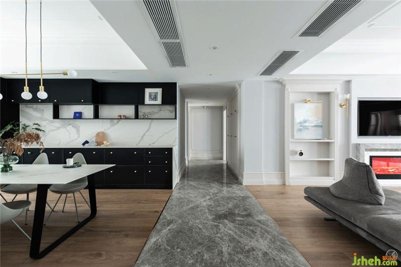 餐廳、走廊和客廳通過(guò)胡桃木地板、炭灰色大理石瓷磚來(lái)做最干凈利落的空間區(qū)分,極致簡(jiǎn)約。