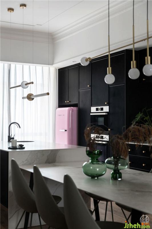 粉色的Smeg復(fù)古冰箱是女主人寶寶最開始就想放進(jìn)西廚空間的,為整個(gè)空間調(diào)和出一絲俏皮而甜美的趣味感,兼具實(shí)用和裝飾性,在色彩也與客廳的單人位沙發(fā)產(chǎn)生了呼應(yīng)。