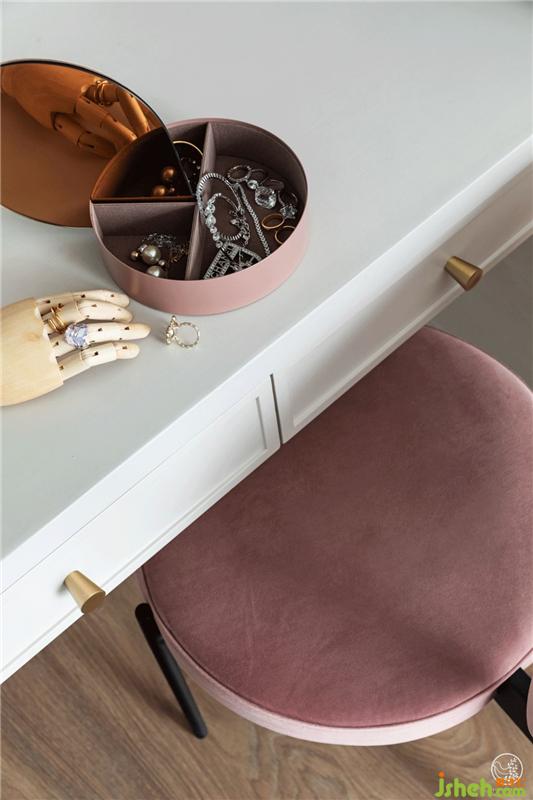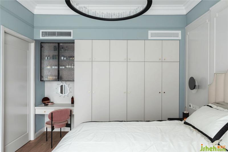 主臥的衣柜是現(xiàn)場(chǎng)定制的,和背景墻的色彩一致,都是質(zhì)感十足的奶油白,收納功能很強(qiáng)大。這一次,有別于將整面墻做成隱形收納柜的常規(guī)操作,我們?cè)谂赃吙桃忾_辟出了一隅特別的梳妝區(qū),只要打開那兩扇黑色金屬框鑲水波紋玻璃的柜門,你就能窺見女主人的“快樂宇宙”。