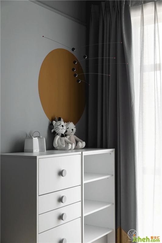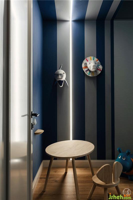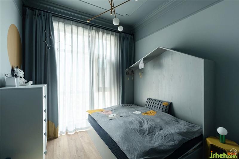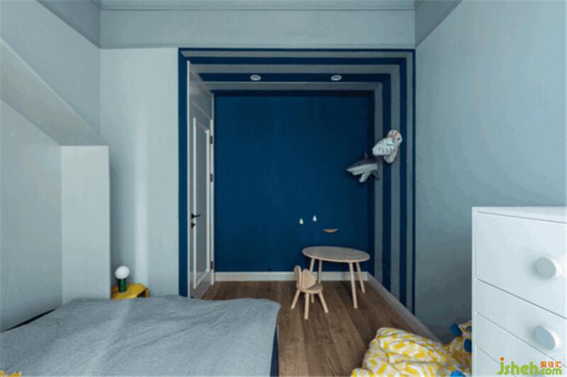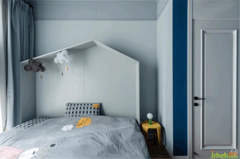 小男孩的房間像這個(gè)海洋般浪漫的家中的一座小島,奇趣而明快,基調(diào)依然是淺灰藍(lán),頂面的藍(lán)又比墻面的藍(lán)稍深一度,窗簾的藍(lán)又比頂面深一度,小床房頂造型可愛又能讓孩子入睡時(shí)更有安全感。