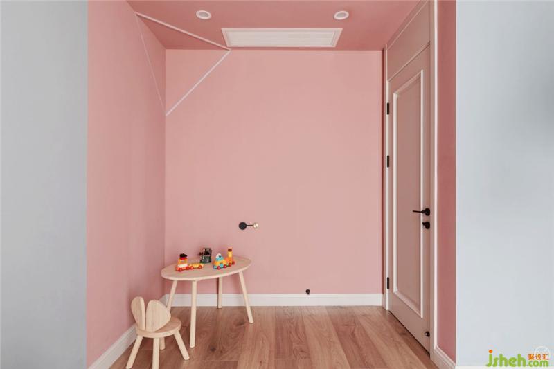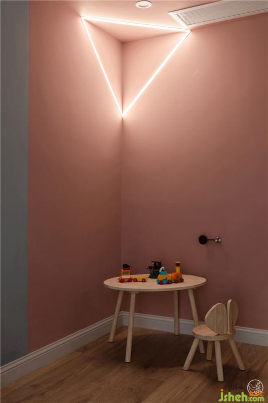 同樣呼應(yīng)男孩房間,門后做了頂面墻面全粉色的設(shè)計(jì),墻角的三角形線條光帶就像愛麗絲的兔子洞,望進(jìn)去就是一個(gè)甜美的異想世界。室內(nèi)設(shè)計(jì)師
