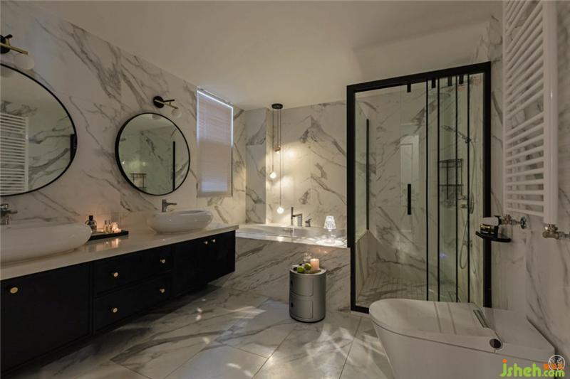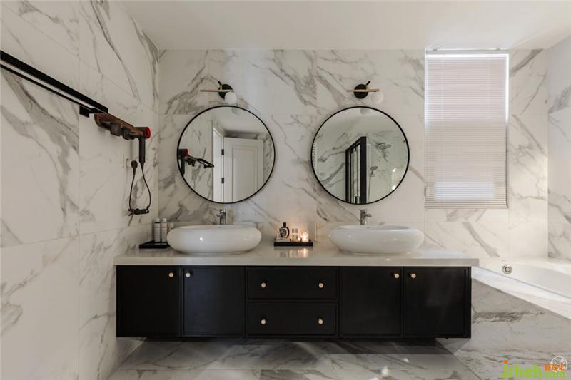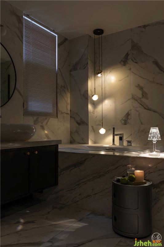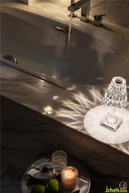 主衛(wèi)是潔凈夢(mèng)幻的卷云,墻面地面都是水墨般流動(dòng)的大理石紋,極具輕柔的整體感。浴缸墻角的圓形吊燈就像流星劃落,小巧復(fù)古的全水晶臺(tái)燈,點(diǎn)上香薰?fàn)T,陷入水的柔情和溫暖中,迎來(lái)一天最放松的時(shí)刻。室內(nèi)設(shè)計(jì)師