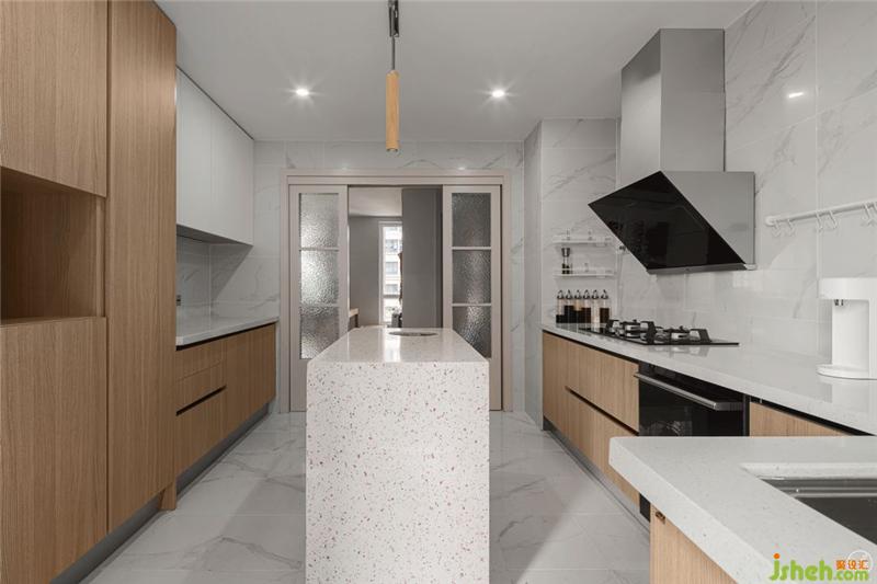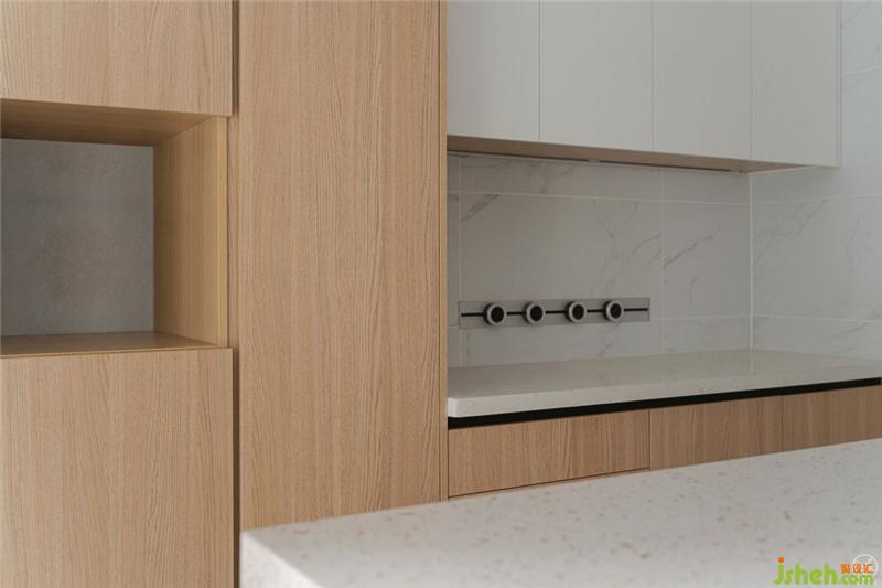 從整體空間的結(jié)構(gòu)布局上看,我們打破了原有的封閉廚房和規(guī)矩的人物動(dòng)線。在中間我們加上一個(gè)根據(jù)操作需求可以左右變化的島臺(tái),既簡(jiǎn)單又增加收納面積,調(diào)和空間里業(yè)主左右活動(dòng)的流暢性和趣味性,打造了一個(gè)寬敞的廚房。