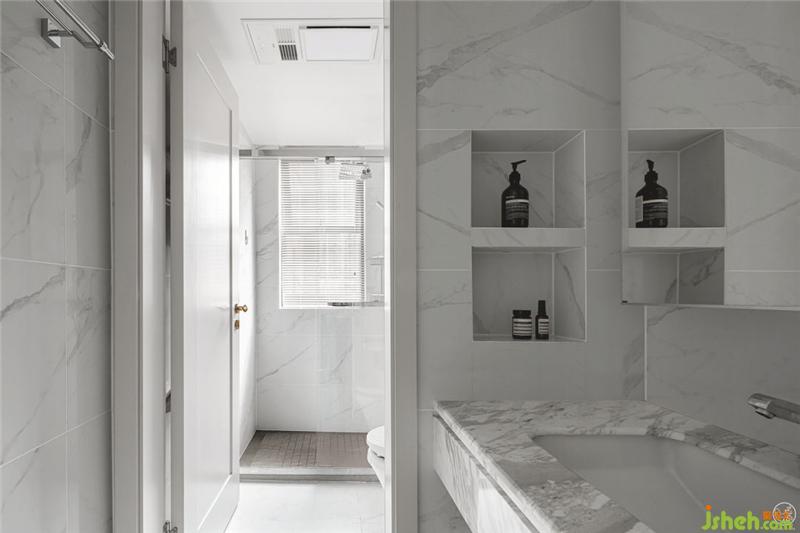 在淋浴間,我們采用粉色石材的地面,視覺上拉伸狹小的空間,浪漫的空間氛圍并帶有優(yōu)雅、高級質感的空間躍然而出。室內(nèi)設計師