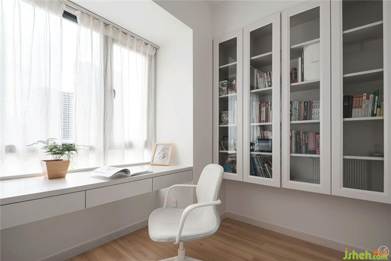 書房中,我們?yōu)閷殞毩粝铝艘恍┤の锻婢?、書籍的收納空間。此外考慮到家里會有朋友、客人的留宿,于是設計了一個懸空的書柜,在書柜距離地面處剛好可以增加一個兩用的沙發(fā)床。