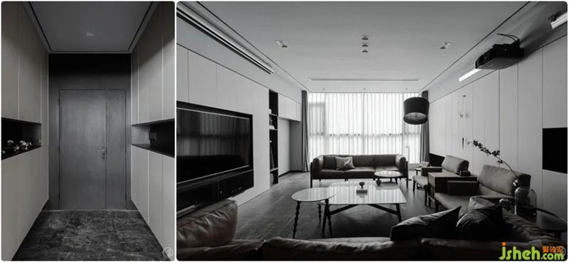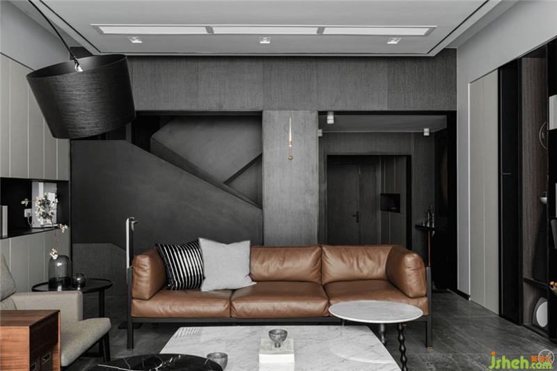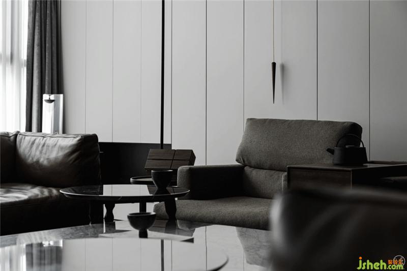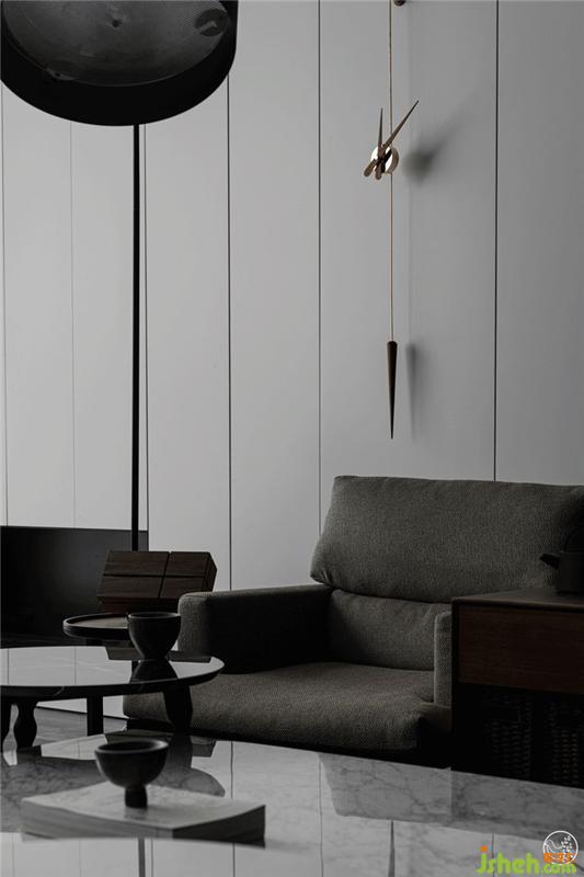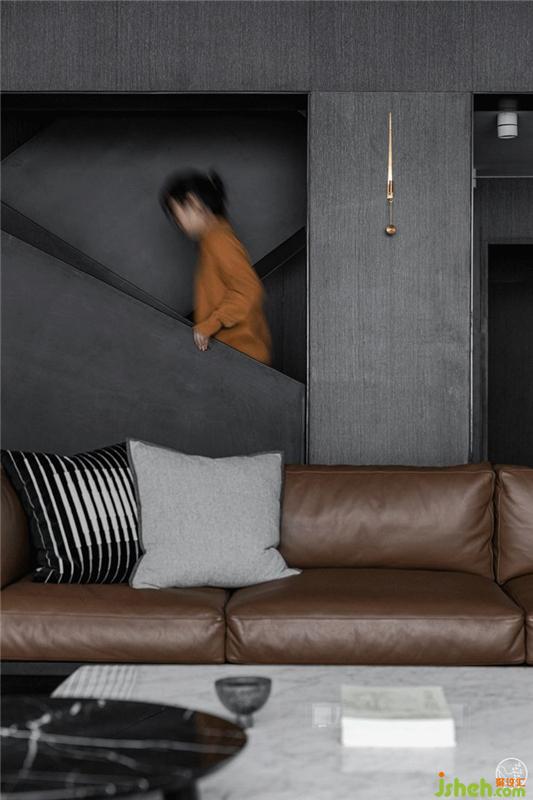我們將從玄關(guān)開始直到整個(gè)客廳的兩側(cè)墻面做成收納柜,外觀看來(lái)則是最簡(jiǎn)單的平行垂直線條。同時(shí)去掉客廳的個(gè)性化、主題化表達(dá),只用沙發(fā)、茶幾、電視來(lái)具象出它的功能。如此一來(lái),這個(gè)由不同明度的灰色為基調(diào)輔以黑色、棕色點(diǎn)綴出層次感的空間,就顯得更為客觀,任何身處其中的使用者都不會(huì)被束縛。別墅裝飾