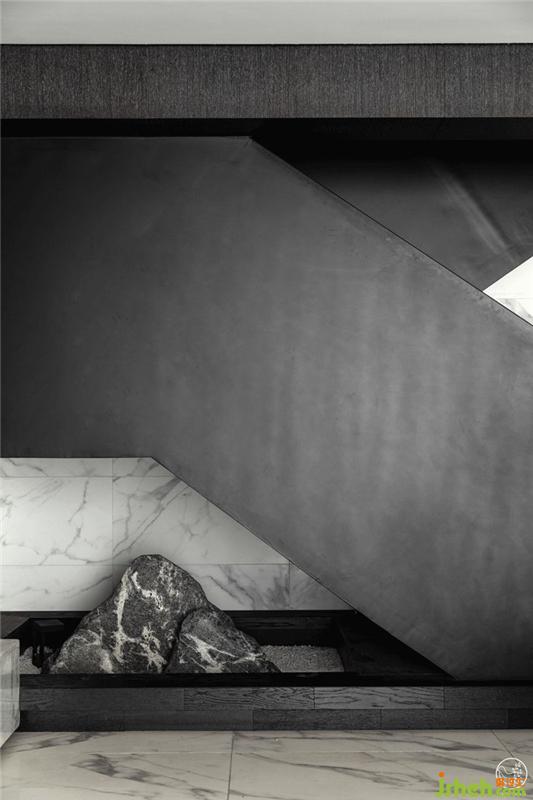 黑色全鋼板扶手,搭配擁有天然紋理的石材梯步,至下是人間煙火,至上則好似能夠通往無限的宇宙。