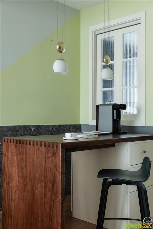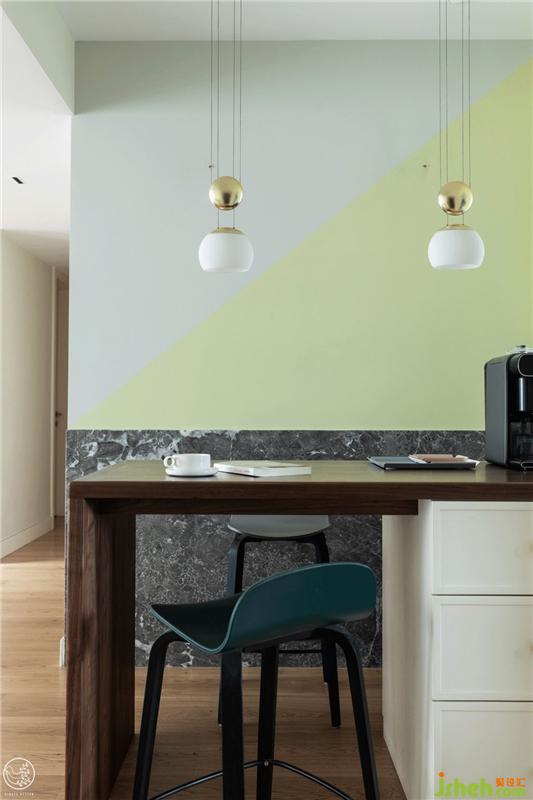 根據(jù)家庭成員的生活習(xí)慣,餐廳設(shè)置了吧臺(tái)。而吧臺(tái)又串聯(lián)起了廚房、餐廳、客廳。Megan一家在每個(gè)區(qū)域或許都能有不同的體驗(yàn)。