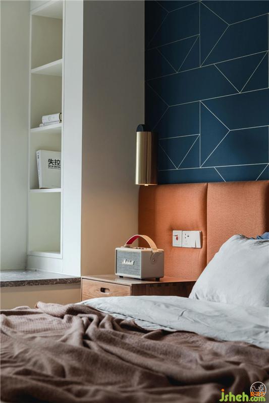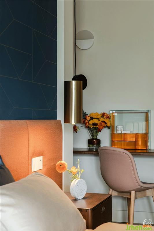 夫妻倆的臥室用了經(jīng)典的藍(lán)橙配色,偏深偏冷的藍(lán)平和了跳脫扎眼的橙,一半是海水,一半是火焰。