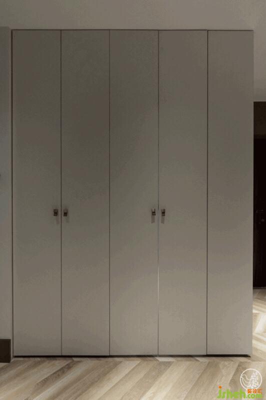 原始的空間戶型進(jìn)門后有一塊相對方正的門廳,我們利用這個(gè)區(qū)域,以柜體代替墻體做了一個(gè)帶儲(chǔ)物功能的隱藏式生活陽臺(tái)。