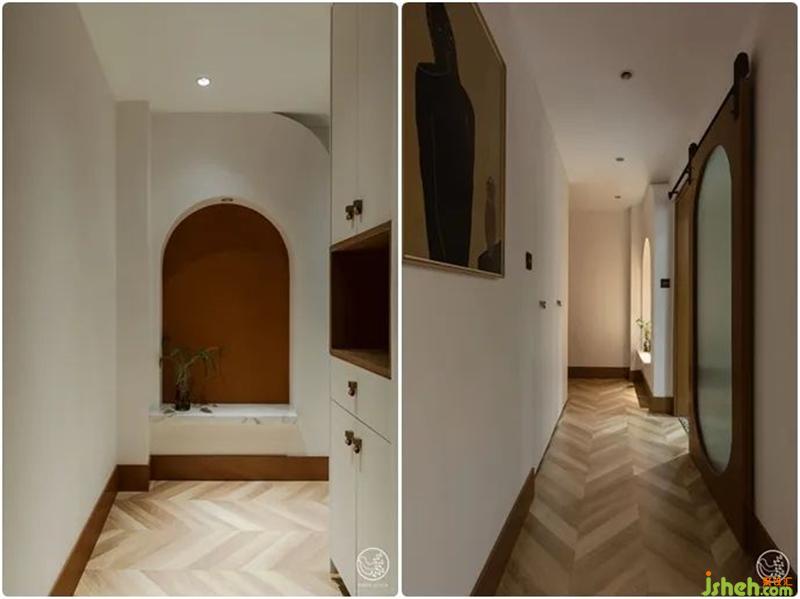 并借此與入戶后正對的廚房,形成了一條門廊。正對大門的墻面,因?yàn)檗D(zhuǎn)角處剛好是水管所在,我們借機(jī)加厚部分墻體做了藝術(shù)處理,放大的拱形壁龕,臟橘色打底搭配大理石臺(tái)面,在白色墻面中跳脫出一絲異域風(fēng)情。