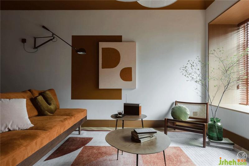 而在電視墻的對面,以簡單的臟橘色塊搭配手繪反色油畫構(gòu)成空間視覺重點(diǎn)。輔以線條干凈的工業(yè)感壁燈,定幀出現(xiàn)代派抽象畫既視感。室內(nèi)設(shè)計(jì)師