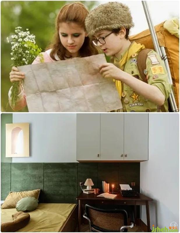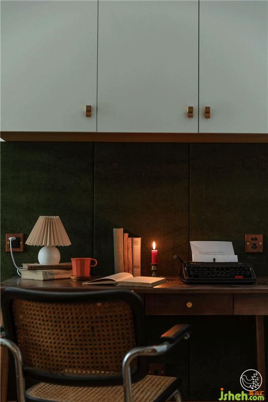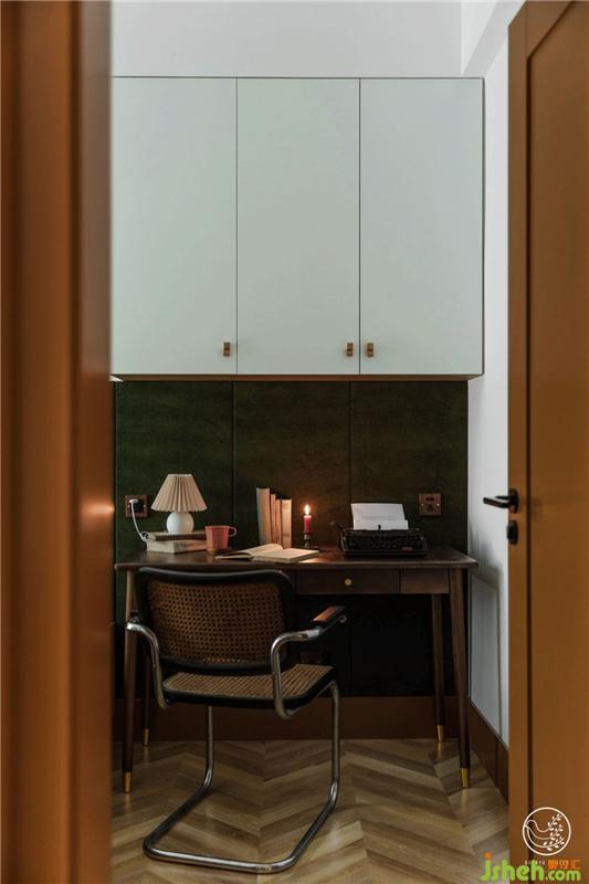 我們以復(fù)古綠乳膠漆搭配同色復(fù)古綠絲絨硬包,搭配茶褐色,視覺上劃分出休息與書寫區(qū),有意打造出速寫手稿般的歐洲中世紀書房既視感,收了一把Thonet中古懸臂椅是全屋最貴的家具,青春就是這樣任性。