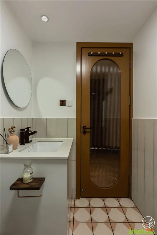 衛(wèi)生間由于自然光源少,我們在門上動了一些手腳。焦糖棕色的門嵌入一塊橢圓形的長虹玻璃,保證私密性的前提下,增加了空間的通透感,而整體空間氛圍依然是靜謐的。