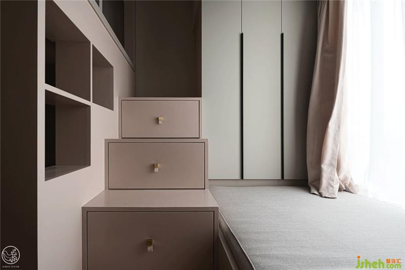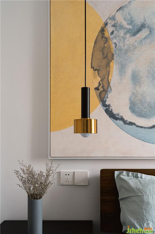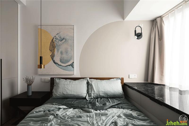 次臥因是父母居住,整體色調(diào)以白色為主,床頭做了一個(gè)沙色的弧形拼色,搭配略為跳躍的水墨畫,到頂?shù)囊鹿?,簡約又溫暖。同時(shí),為增加收納空間,我們在飄窗處特意設(shè)計(jì)了一排抽屜柜。室內(nèi)設(shè)計(jì)師