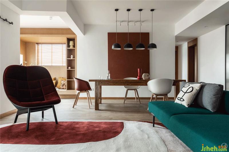 胭脂色與淺棕黃撞色的地毯恰好將客廳的整體色調(diào)增加了濃重的感性意味,而來自HAY的單人沙發(fā)椅不僅極富設(shè)計感,色彩是更深一些的胭脂色,猶如宋畫中精致的筆觸,耐人尋味之外,它還是男主人Flow對我們提出的唯一“需求”。對于愛聽音樂的他,一把舒適感極佳且能隨意擺放的椅子,就是他的極樂宇宙中心!