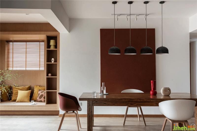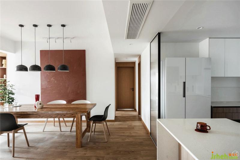 餐廳紫砂色的抽象定制油畫讓留白的空間多了一絲厚重的故事感,極簡的實木餐桌搭配HAY的圍裹型餐椅,白色,紫砂色,慵懶舒適之中又透露出一絲克制,正如我們對食物應(yīng)該有的態(tài)度。裝修設(shè)計