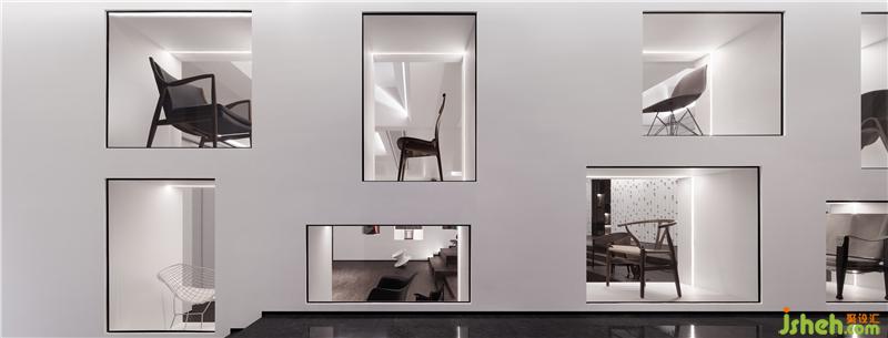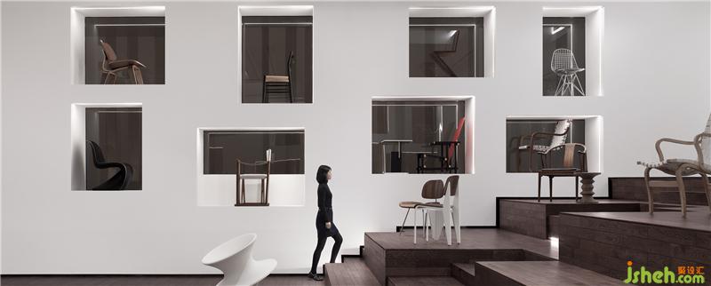 實(shí)體藝?yán)仍O(shè)于多功能廳兩側(cè),同時(shí)也是幾個(gè)重點(diǎn)空間的主要交通節(jié)點(diǎn)。在這里,設(shè)計(jì)師選取了和生活最為密切的器具——“椅子”進(jìn)行展示,幾十張經(jīng)歷歲月洗滌而沉淀下來(lái)的經(jīng)典座椅既是空間展品,也是可以不斷更換并體驗(yàn)的坐具,讓體驗(yàn)者成為了經(jīng)典演繹的一部分。