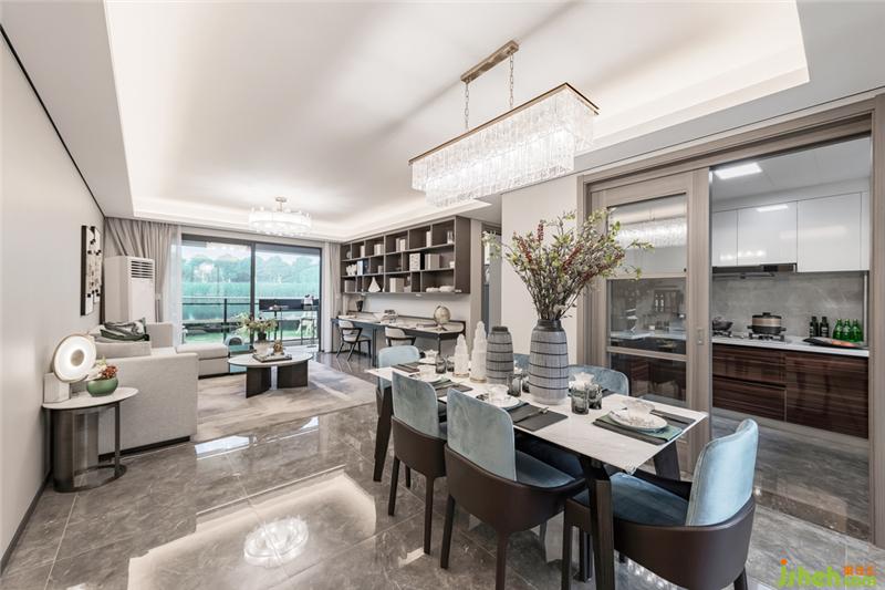 餐廳延續(xù)客廳低飽和度的色調(diào),搭配黃銅水晶吊燈與雅致餐桌椅,打造出精致、高雅的空間質(zhì)感。與客廳空間互借共通,吊頂簡約大氣。空間布局考慮功能性與舒適性的平衡,通過材質(zhì)劃分功能屬性的差異,使得客餐廳空間既融會貫通,又互相獨(dú)立開來。樣板間設(shè)計(jì)