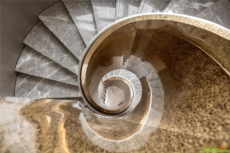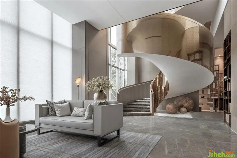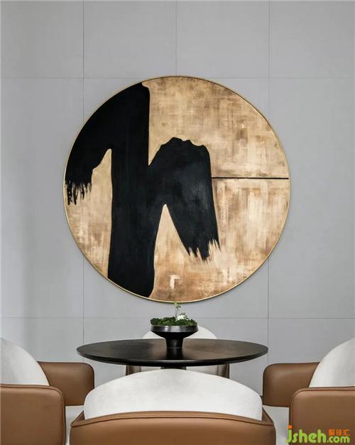 與弧形樓梯相呼應(yīng),藝術(shù)品與燈具采用圓形造型,燈具采用意大利品牌造型款式,金屬與LED相結(jié)合。
