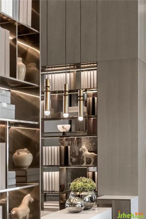 飾品展示柜的打造中,運(yùn)用高品質(zhì)的飾品,采用對(duì)稱,留白,對(duì)景等設(shè)計(jì)手法進(jìn)行打造,提升整個(gè)空間的趣味性與文化氣質(zhì)。