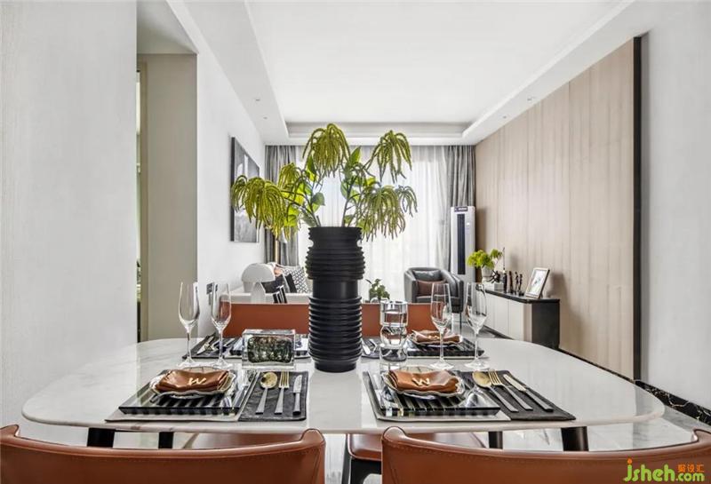 餐廳右側(cè)墻面木飾面為立面增添了層次感,餐桌與立面的色彩自然融合,精致的餐具是美食的好搭檔,享受一日三餐的味覺歸屬。質(zhì)感軟裝材質(zhì)和色彩與客廳呼應,壹抹綠意點綴出了餐廳空間中自然雅致的氣息。