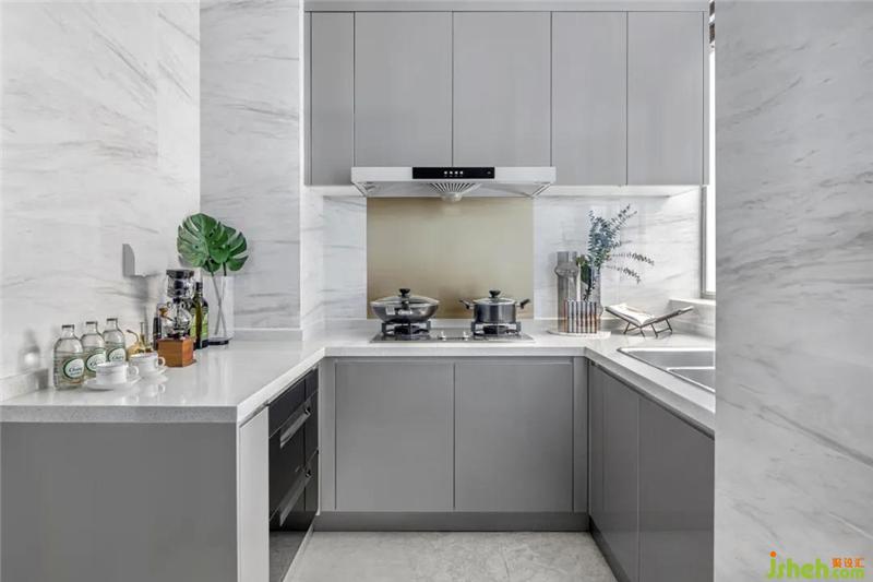 廚房的墻面使用了大理石質(zhì)感瓷磚,淺白色的干凈配色讓整個空間更通透。左側(cè)臺面,布置了趣味的擺件,造型圓潤的花瓶增添了整個廚房的活力。