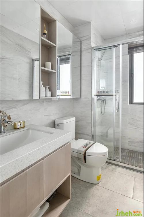大理石質(zhì)感的衛(wèi)生間很幹凈通透,大理石瓷磚墻壁與暖調(diào)儲物櫃相得益彰,樣板房設計直邊鏡子展現(xiàn)了利落的直線感,豐富空間的視覺效果。