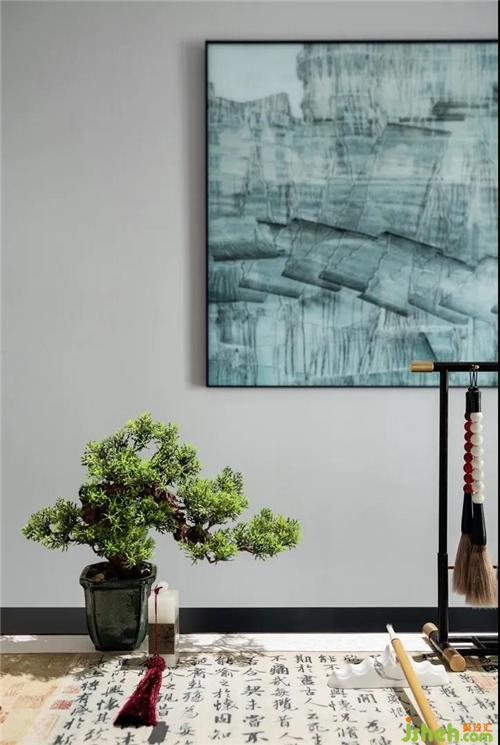 高級灰在空間層次關(guān)系中彰顯出獨特的當代東方氣質(zhì),家具、飾品、掛畫的灰藍點綴色,使空間靈性十足,韻味流長。