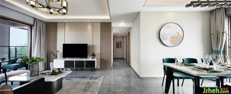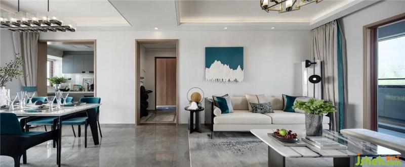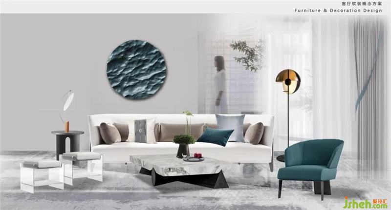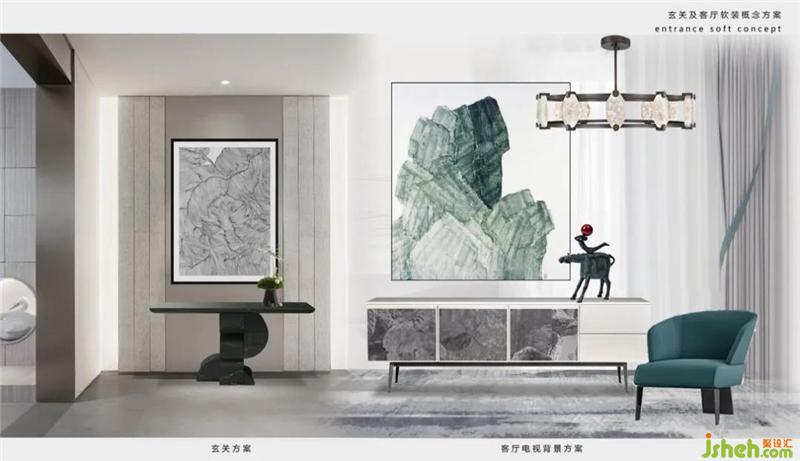 此空間風格定位為現(xiàn)代中式風格, 文化、雅奢,為我們此空間的主基調(diào)。在客廳的打造上,樣板房設(shè)計師采用2019年米蘭流行色——灰綠色調(diào),墻面藝術(shù)品的靈感來源于“湖面漣漪”的形象,微風拂過,波光粼粼,寧靜而暢然。