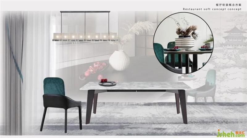 基于空間整體靜謐、詩意的藝術(shù)效果,設(shè)計師以淡雅精致作為空間主色調(diào),沿用水元素裝點空間,提取湖綠色作為點綴色,讓整個空間更顯寧靜和靈動。