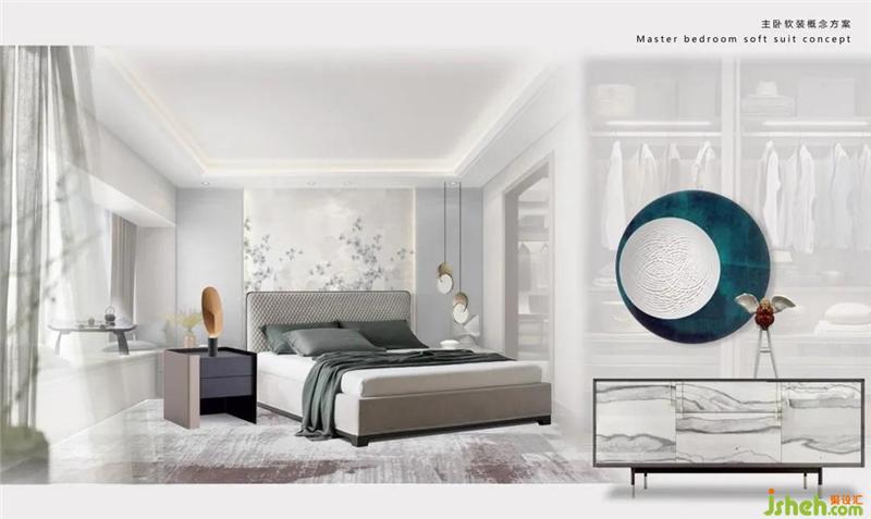 主人房空間的整體氛圍雅致奢華,家具選型上沿襲雅奢感,床頭背景細節(jié)搭配引入皮革質(zhì)感和色澤,在柔和的空間環(huán)境中,凸顯品質(zhì)感,產(chǎn)生新的空間張力和視覺想象。