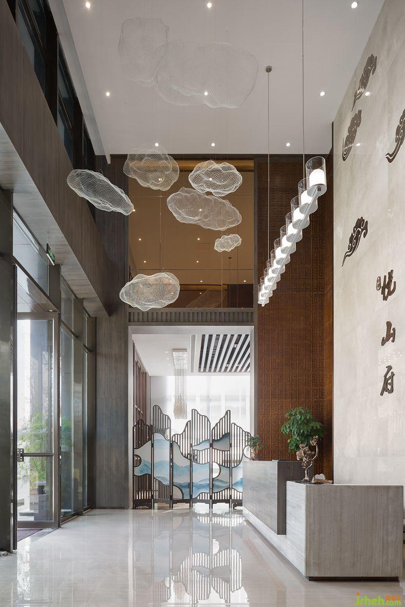 釉白墻地面干凈、溫暖,兩層通高的上部位置借鑒飛檐彩繪手法,創(chuàng)作出山云圖為空間增添自然藝術(shù)氛圍,更像暖流包圍著空間的一切。