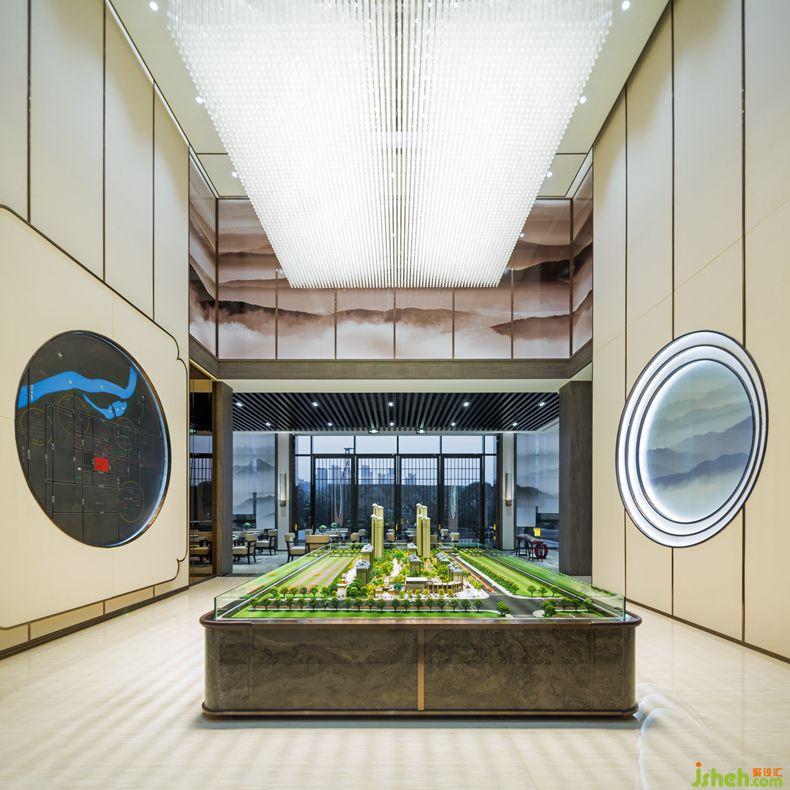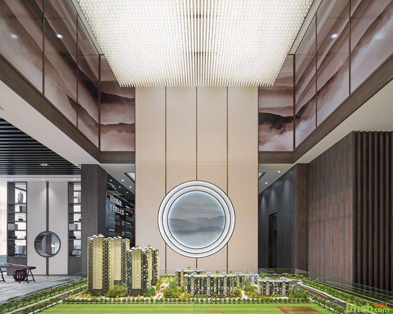 沙盤區(qū)墻面運(yùn)用中式門型元素與沙盤相呼應(yīng),蘊(yùn)含著“天圓地方”的中式情懷。