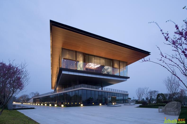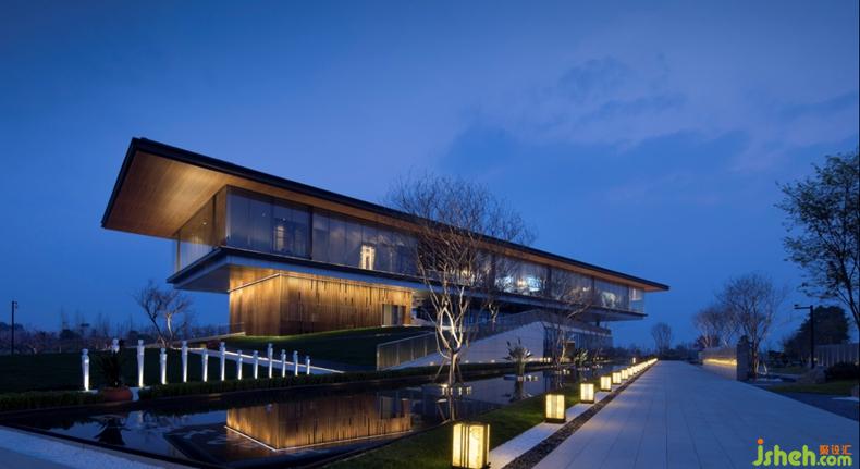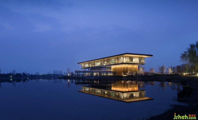 本案為文旅地產(chǎn)項(xiàng)目,由溫泉酒店、別墅區(qū)和高層區(qū)組成,在項(xiàng)目開放時(shí)作為銷售中心,用于展示、接待和辦公。設(shè)計(jì)主體為一棟兩層現(xiàn)代簡(jiǎn)約建筑,身處白馬湖腹地,三面環(huán)水,因地形起伏,水岸與湖面有一定的落差,采用多層次退臺(tái)親水式的建筑手法,外墻采用全景式玻璃幕墻圍合。《園冶》里記,“榭者,藉也。籍景而成者也,或水邊,或花畔,制亦隨態(tài)?!表樀鼐蛣?shì),依水而建的建筑頗有《園冶》中水榭的意味,一半在湖岸,一半在水上, 四面都開敞著,很通透,往東可遠(yuǎn)眺龍泉山脈朦朧的山景,西南可看蜿蜒的北河水景。山間朝暮,佳木繁陰,來往行人,還有月光和花香,以及大宇宙的光景,都可以在這里看到,“坐觀萬景得天全”說的興許就是這般景致。兩層建筑根據(jù)樓層劃分了不同的功能區(qū)域,一樓為會(huì)所,擁有多種業(yè)態(tài)形式,包括閱讀區(qū)、健身區(qū)、親子互動(dòng)以及餐飲等休閑娛樂功能;二樓為沙盤模型區(qū)、洽談區(qū)、簽約區(qū)和辦公區(qū)等展示中心功能。