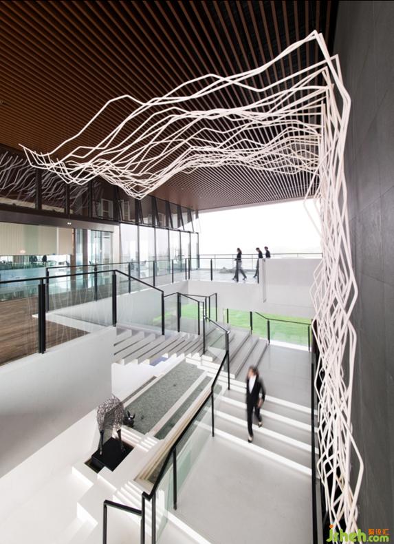 室外遠(yuǎn)處山峰漸隱,近處山溪潺潺,水畔嘉木蔥蘢,室內(nèi)隔斷運用藝術(shù)玻璃展現(xiàn)出峰巒疊嶂的挺拔與俊秀,煙云繚繞間一重重落地格柵屏風(fēng)布局對稱,遞進(jìn)產(chǎn)生秩序之美,增強空間進(jìn)深感,從功能上做到隱藏空間立柱,同時營造出圍合庭院層層院落的大方雍容之意境;一層和二層空間采用層疊式矩形旋轉(zhuǎn)階梯銜接,造型樸拙雄渾又不乏靈氣,既與空間元素上下呼應(yīng),又如同李白曾做詩:“蜀道難,難于上青天”般,營造出一種不可凌越的磅礴氣勢。