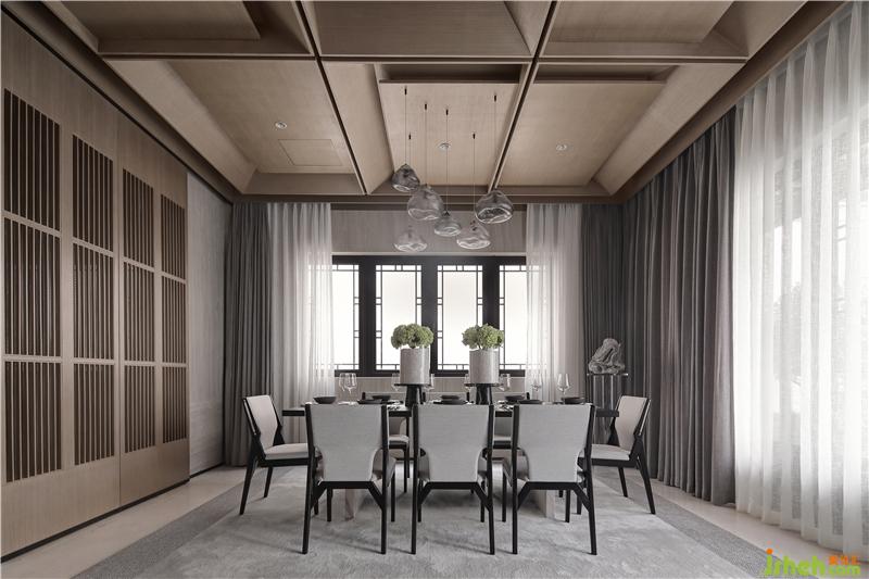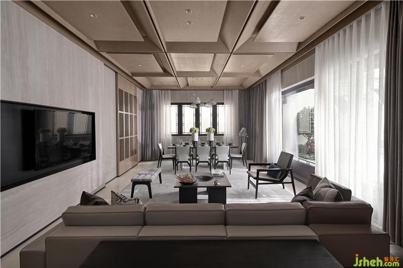 室內(nèi)公區(qū)天花提煉中式梁架結(jié)構(gòu)和坡屋結(jié)構(gòu),將其簡(jiǎn)化為經(jīng)典九宮格木構(gòu)造型,用現(xiàn)代手法演繹中式韻味,天花與墻面在色調(diào)上的呼應(yīng)統(tǒng)一,強(qiáng)化了空間在視覺(jué)上的延伸感。一層作為生活起居空間,樣板房設(shè)計(jì)將客餐廳與室外完全打開(kāi),將更多的自然景觀引入室內(nèi),模糊室內(nèi)與室外、建筑與自然、人與自然的邊界,交互形成,渾然共生。