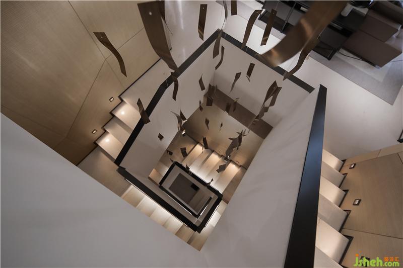 樓梯燈光設(shè)計(jì)選擇了更為人性化的點(diǎn)光源,從墻面透光到步梯,均勻分布,光感溫和、溫馨。一條以銅片為素材的手工藝術(shù)裝置輕盈如飄帶,貫穿別墅四層的樓梯天井。幾何硬朗與靈動(dòng)輕盈,形成對(duì)比反差,也讓空間生動(dòng)起來(lái)。