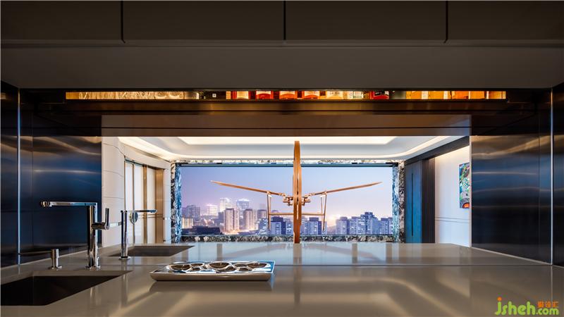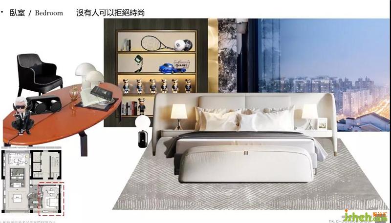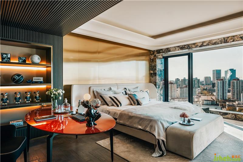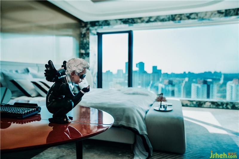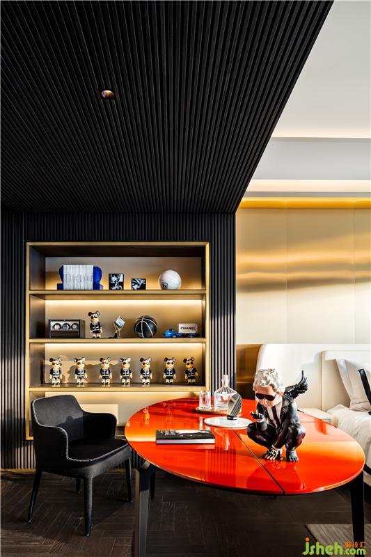 主臥套房以「老佛爺」卡爾·拉格斐為原型,呈現(xiàn)了一個(gè)活出豐滿獨(dú)立人格的傳奇人物的居室。壁柜上的香奈兒玩偶與陳設(shè)、書桌上以「老佛爺」為靈感的小型雕塑,鮮明地代出了這一空間的致敬主題。