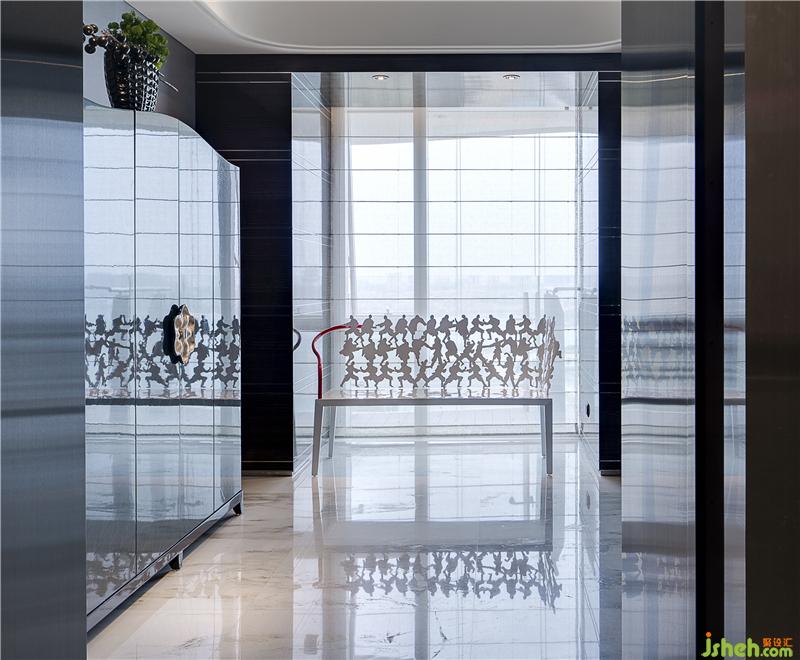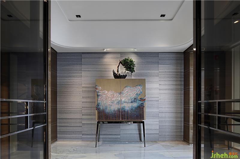 主要材料:銀灰洞石,琺瑯漆柜,雪花白石材,花梨木實木,萊姆石,尤加利木皮,黑檀木皮,壁紙,皮革,茶鏡,茶色玻璃,鍍鈦板