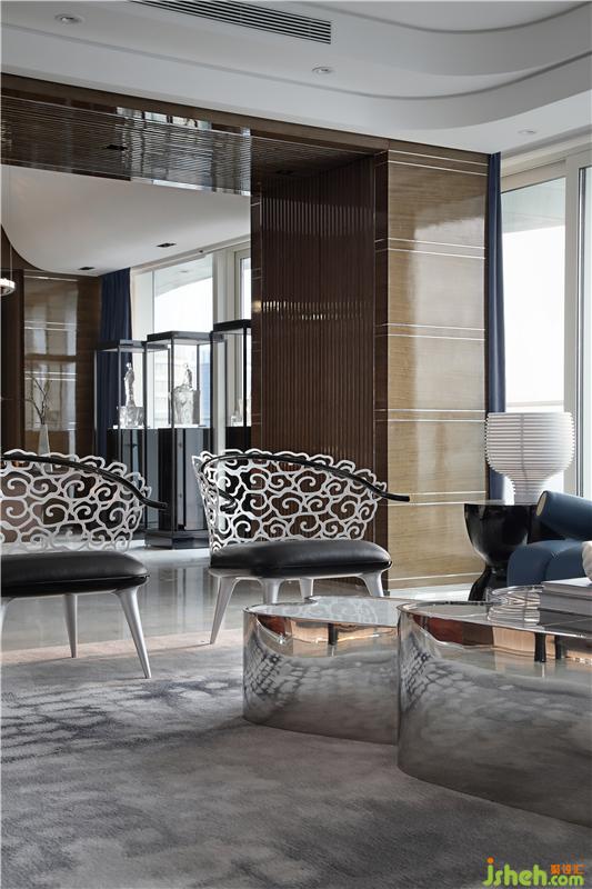 客廳以留白方式處理讓墨藍(lán)色德光居“重山沙發(fā)”成為主角,以德光居“青云椅”椅作為配角,夢(mèng)云椅背上只有0.3公分薄的不銹鋼板,連綿的祥云圖案將椅背與扶手連接,鏤空的云朵花紋讓這把椅子有著不羈的流動(dòng)感;暈染畫般的地毯上搭配著德光居猶如云朵的曲線茶幾“沐云”,珍貴精致的材質(zhì)與云形的幾面優(yōu)雅的幾腳,沐云幾與夢(mèng)云椅一起讓整個(gè)空間也如詩(shī)如畫了起來。