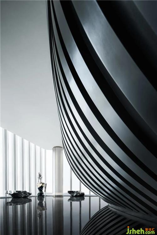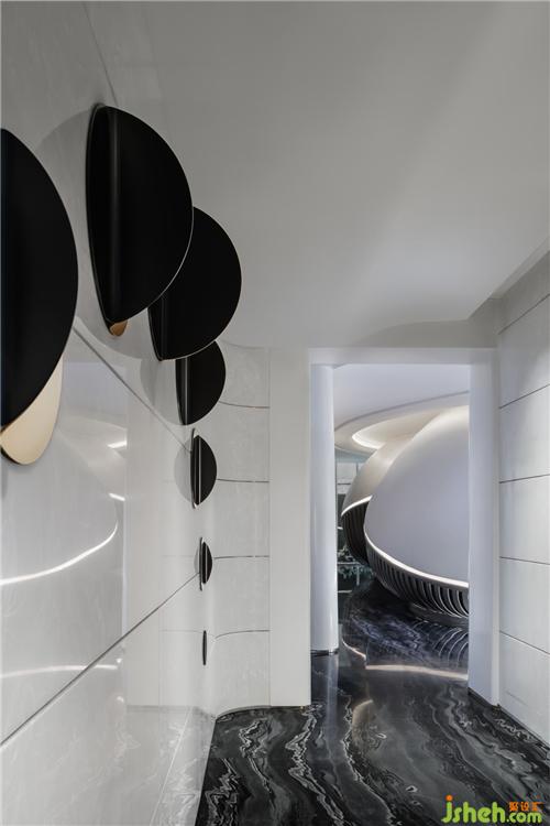 * 電梯廳丨墻面用黃銅材質(zhì),打造「月相」,將藝術(shù)融入空間;不遠(yuǎn)處的「飛船」則是對空間藝術(shù)化更加完整的表述