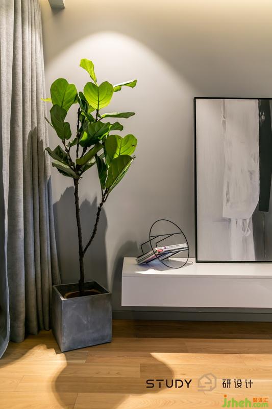 客廳明亮的地板奠定了整個家柔和、沉穩(wěn)的裝修風(fēng)格基礎(chǔ)?;疑L(fēng)格的電視背景墻給客廳空間增添韻律,室內(nèi)設(shè)計師利用協(xié)調(diào)的色彩搭配,創(chuàng)造出特別的設(shè)計風(fēng)格,煙灰色的運用使得空間的色彩更為平衡。
