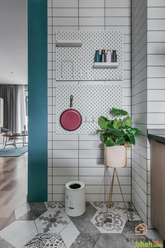 實(shí)用的洞洞板,可以安置屋主烹飪各類所需,鍋具、刀具、瓶瓶罐罐都可以整齊放在這里,再也不用翻箱倒柜的去找。