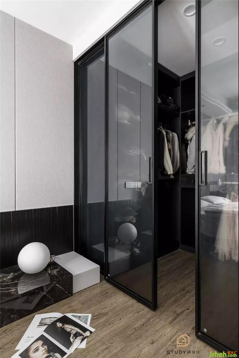 深灰色夾絲玻璃是在廣東定制并由本地拼裝生產(chǎn),對(duì)于每一個(gè)材料細(xì)節(jié),都容不得將就,它與黑色定制衣柜的組合更像是一處秘境,勾引著初次見面的人去一探究竟。